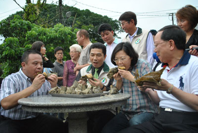 民進黨主席蔡英文13日到臺北縣貢寮鄉三合院與婆婆媽媽一起包粽子。