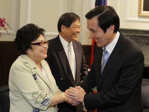 馬英九(前右)8日接見吳伯雄率領(lǐng)的第6屆兩岸經(jīng)貿(mào)文化論壇代表團(tuán),與臺灣“人民最大黨”主席許榮淑(前左)握手致意。圖片來源:“中央社”