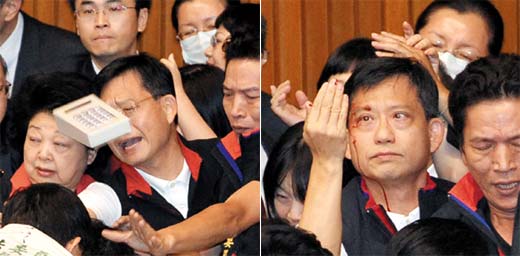 臺(tái)灣“立法院”臨時(shí)會(huì)昨天下午審議ECFA,爆發(fā)肢體沖突。混亂中,書本大小的定時(shí)器(左圖)突然飛向國民黨“立委”聚集處,擊中“立委”吳育升(右圖)眼角流血,送醫(yī)急救,縫了八針。(臺(tái)灣《聯(lián)合報(bào)》圖)