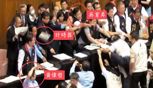 昨晚國民黨團(tuán)檢視錄像畫面發(fā)現(xiàn),民進(jìn)黨“立委”黃偉哲扯下定時(shí)器后,以一記“勾射”擲向國民黨“立委”,正好砸中吳育升頭部。(臺(tái)灣《聯(lián)合報(bào)》圖)