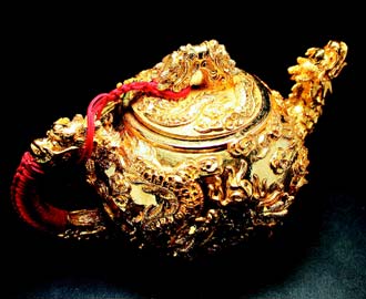 臺“監(jiān)察院”公布財產(chǎn),“立委”徐耀昌現(xiàn)金、存款、有價證券三項申報欄都空白,卻擁有一具金雕名師鄭應(yīng)諧精雕的九龍金茶壺,當(dāng)時價值60萬元,現(xiàn)已翻了好幾倍。 圖片來源:臺灣《聯(lián)合報》