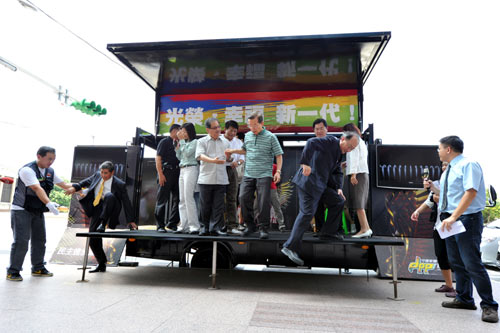 因應年底“五都”選戰,民進黨4日下午公布“二代小鷹號”,它以“變形金剛”為概念,改裝3.5噸的貨車,集指揮、宣傳、舞臺、移動辦公室與移動商店車等多功能。不僅可擔任競選活動的指揮車、候選人戰車,也是一輛可上山下海的移動舞臺。