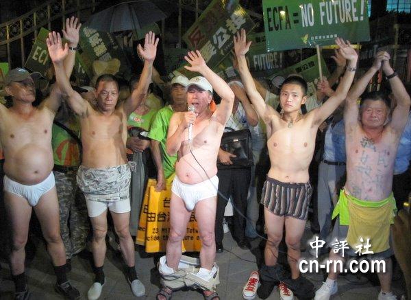 蔡丁貴(中)等人在ECFA審查通過后,再度脫下上衣與外褲,說民進(jìn)黨保住他們的內(nèi)褲。(中評社 黃筱筠攝)