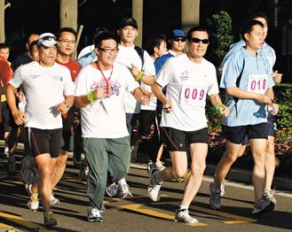 臺灣光仁社會福利基金會主辦的“光仁陪你慢慢跑”活動,今早在孫中山紀念堂熱鬧開跑。馬英九應邀到場,換上運動短褲,大秀“馬腿”。他替9公里的競賽組鳴槍,接著加入路跑人群,并帶領7名身心障礙朋友路跑,輪流跑完3公里的休閑組路程。