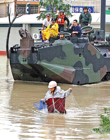臺(tái)軍方出動(dòng)水陸兩棲戰(zhàn)車至高雄市楠梓區(qū)緊急救援,有些民眾則在水里悠閑地捕魚。 來源:臺(tái)灣《中國時(shí)報(bào)》