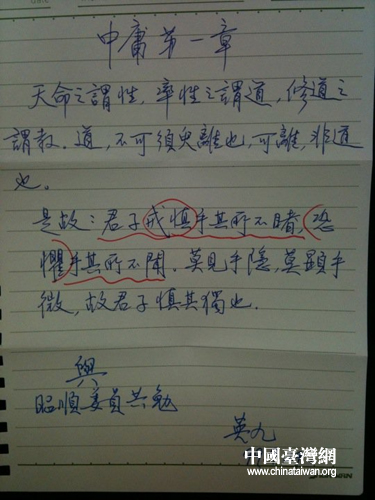 馬英九在小紙條上節(jié)錄《禮記·中庸》中的開篇名句:“天命之謂性,率性之謂道,修道之謂教。道,不可須臾離也,可離,非道也。是故:君子戒慎乎其所不睹,恐懼乎其所不聞,莫見乎隱,莫顯乎微,故君子慎其獨也。”并用紅筆圈起了“戒慎”與“ 恐懼”兩詞,期待與黃昭順共勉。