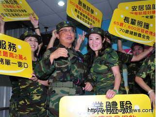 中國臺灣網10月15日消息 據臺灣“今日新聞網”報道,臺中市長胡志強今日(15日)下午上演了一場搞笑版的新兵日記。胡志強化身“胡班長”,帶領扮演士兵(班兵)的8位市議員參選人,在競選總部發表“大臺中青年政策”白皮書。