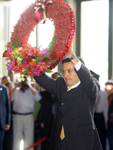國民黨主席馬英九24日慶祝國民黨建黨116周年,前往臺北孫中山紀念館向孫中山銅像獻花致敬。 圖片來源:“中央社”