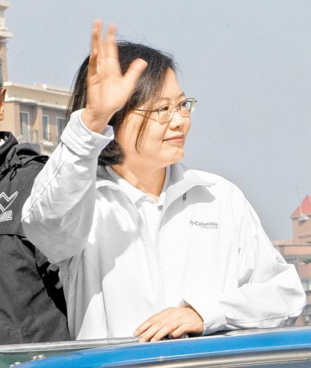 參選新北市長失利的民進黨主席蔡英文29日從蘆洲競選總部出發,展開謝票行程,她站在宣傳車上,沿途向支持者揮手致意。 來源:臺灣《中國時報》