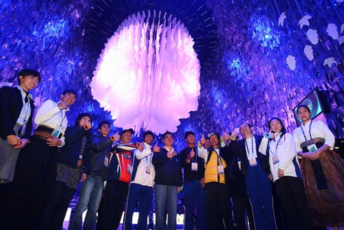 臺北市長郝龍斌(左7)9日陪同亞運中華臺北隊選手參觀花博夢想館,在機械花朵下合影留念。圖片來源:臺灣“中央社”