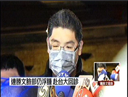 連勝文10日上午要前往臺大醫(yī)院進行復診、換藥,在赴醫(yī)院前他特別短暫公開現身,讓媒體可以看到他臉上的傷勢及目前身體狀況。連勝文雙眼明顯浮腫,他戴著眼鏡及口罩,右眼邊上貼著透氣膠布。連勝文走起路來仍顯得蹣跚,媒體發(fā)現他的白頭發(fā)似乎變多了。
