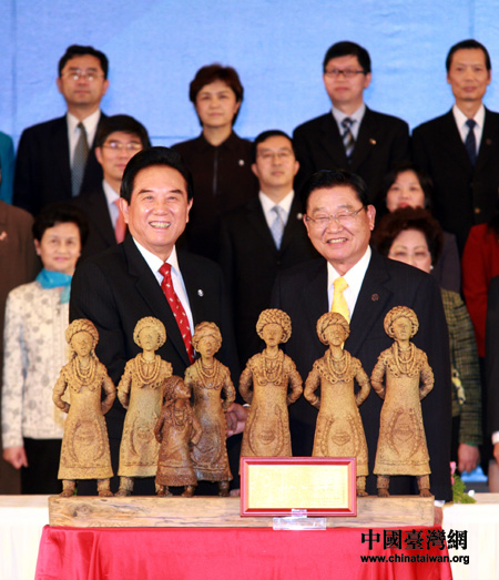 12月21日下午,海協(xié)會(huì)會(huì)長陳云林與海基會(huì)董事長江丙坤正式簽署《海峽兩岸醫(yī)藥衛(wèi)生合作協(xié)議》,雙方并在協(xié)議簽署后互贈(zèng)禮品。圖為海協(xié)會(huì)致贈(zèng)海基會(huì)方面的雕塑作品《好事連連》。(中國臺(tái)灣網(wǎng) 鐘寶華 攝)