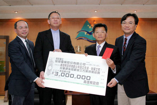 據“中央社”報道,協禧電機公司22日到高雄縣政府捐款300萬元(新臺幣,下同),協助高雄縣府推動“少年自立生活”、“兒童課后照顧”及“兒童及少年中途之家”業務。高雄縣長楊秋興頒出縣府最后1張感謝狀。