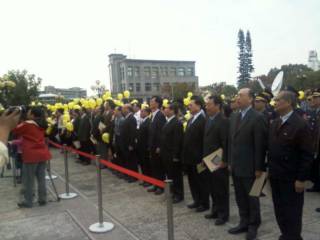高雄縣政府將走入歷史,高雄縣長楊秋興在縣府員工列隊歡送下,揮別執政9年的縣府。員工們獻上鮮花、擁抱,為楊秋興加油打氣,讓他感動落淚。“臺灣基督長老教會”鳳山教會教友下午到高雄縣政府報佳音,贈給縣府員工糕點糖果,并在牧師的帶領下,為將卸任的楊秋興祈禱。高雄縣政府員工則在縣府前留影紀念。(中國臺灣網 馮存健)
