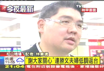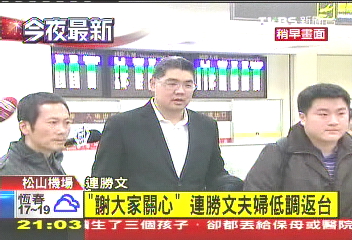 連勝文11月26日晚助選國民黨新北市議員參選人陳鴻源時遭槍擊,受傷后連勝文十分低調(diào),只以戴口罩的面貌出現(xiàn),日前到上海復診腎臟腫瘤,今晚返回臺灣時,卻未戴口罩,全臉曝光。