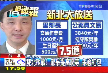 中國臺灣網(wǎng)1月21日消息 據(jù)臺灣TVBS電視臺報道,臺北市、新北市近日在提升公務(wù)人員待遇方面相互較勁,臺北市長郝龍斌表示,他要幫臺北市的公務(wù)人員爭取職等升級,理由是臺北市業(yè)務(wù)量龐大,應(yīng)該給公務(wù)人員更好的福利。同樣,新北市長朱立倫也決定給公務(wù)人員發(fā)“紅包”,包括基層的鄰、里長和警察及消防員等,每個月發(fā)放1000元(新臺幣,下同)交通補(bǔ)助,并增加他們的文康費用。郝龍斌、朱立倫兩人替基層謀福利,更像是臺北市與新北市在爭取領(lǐng)頭地位。