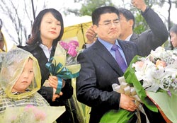 陳光標一行昨日上午冒雨前往“筠園”,向已故歌星鄧麗君墓園獻花致意。圖片來源:臺灣《中國時報》