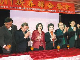 出席的蔡英文、呂秀蓮、謝長廷、蘇嘉全等人在主辦單位邀請下,一同上臺舉杯向與會人士敬酒,呼吁未來在“立委”、2012“大選”時團結一致,共同奮斗。(中國臺灣網 馮存健)