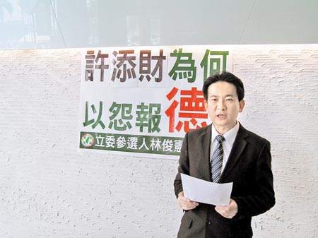 林俊憲昨天公開以大字報“以怨報德”的強烈字眼批評許添財,他說,賴清德在處理吳健保議員等人的要求,連“行政院長”吳敦義、民進黨主席蔡英文等人都表達相挺之意,想不到只有許添財落井下石,公開嘲諷。