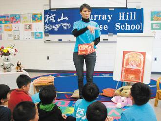 周美青為紐澤西梅山中文學(xué)校二年級(jí)孩子說故事,教他們學(xué)好中文。