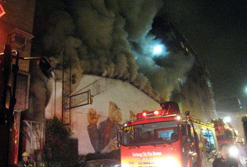 臺中市中興街知名的夜店阿拉(ALA)6日凌晨發生大火意外,火場冒出陣陣濃煙,部分顧客逃生不及,造成9死12傷慘劇。 圖片來源:“中央社”
