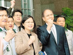 積極走訪▲民進(jìn)黨主席蔡英文(右二)18日拜會(huì)臺(tái)當(dāng)局前“行政院長(zhǎng)”游錫堃(右),受到游錫堃與多位市議員迎接,游錫堃與眾人隨即握拳大喊“加油!”圖片來源:臺(tái)灣《中國時(shí)報(bào)》