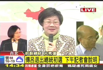 之前高調(diào)宣布投入民進(jìn)黨內(nèi)初選的呂秀蓮,22日突然宣布退出“總統(tǒng)”選舉,并發(fā)表了四點(diǎn)聲明。 圖片來源:臺(tái)灣TVBS