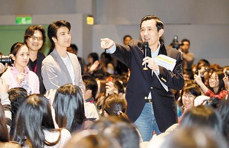 馬英九(右)與歌手王力宏(右二)29日在臺(tái)灣清華大學(xué)對(duì)談。結(jié)束后2人走到臺(tái)下與學(xué)生互動(dòng),引起熱烈回響。來(lái)源:臺(tái)灣《中國(guó)時(shí)報(bào)》