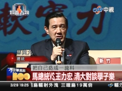 臺(tái)灣清華大學(xué)慶祝“百年校慶”,3月29日邀請(qǐng)馬英九與臺(tái)灣偶像歌手王力宏以為題 “夢(mèng)想造就軟實(shí)力”對(duì)談。據(jù)臺(tái)灣《今日新聞》報(bào)道,61歲的馬英九和35歲的王力宏都穿著西裝搭牛仔褲出席,主持人、前臺(tái)灣清華大學(xué)校長(zhǎng)劉炯朗一度要求兩人唱歌,馬英九笑說(shuō),“在王力宏面前班門弄斧,不是要我老命嗎?”王力宏則說(shuō),“總統(tǒng)”應(yīng)該不好當(dāng)吧?后來(lái)王力宏清唱一段英文歌,才引導(dǎo)馬英九唱出一個(gè)字,博得全場(chǎng)熱烈掌聲。