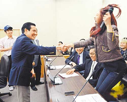 一名女大學(xué)生與馬英九握到手,興奮地大叫。圖片來自網(wǎng)絡(luò)