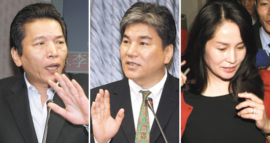臺“行政院公共工程委員會主委”李鴻源(中)、“立委”李鴻鈞(左)這對兄弟檔,在老媽“孔融讓梨”的指示下,質詢時“兄友弟恭”。之前與李鴻鈞交情很好、與李鴻源傳出緋聞的“立委”高金素梅(右),昨天則低調現身,簽到后立即快閃,并未上演“小三大反擊”。