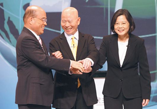 民進(jìn)黨2012臺灣地區(qū)領(lǐng)導(dǎo)人初選最后一場電視政見發(fā)表會20日登場,參選人蘇貞昌(左起)、許信良、蔡英文先禮后兵。圖片來源:臺灣《聯(lián)合報(bào)》
