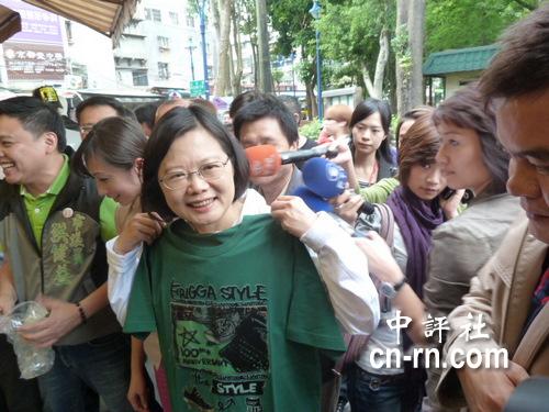 據中評社報道,民進黨主席蔡英文昨天到臺北市著名服飾批發市場─五分埔商圈掃街拜票,除呼吁支持者在家等民調電話,順道捧場買了一件新臺幣380元的正綠色T恤。老板看到蔡英文比來比去,東瞧瞧、西看看,連忙說要送她,蔡英文直說不行,堅持要用買的。