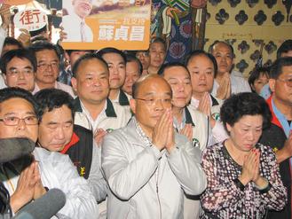 卡神民調外泄事件,蘇貞昌(前排中)昨天到新北市新莊區福德宮參拜,指出不能公布民調很明確,沒有灰色地帶。