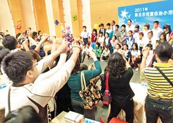 新北市政府29日舉辦大市長(zhǎng)與小市長(zhǎng)的高峰對(duì)談,小市長(zhǎng)會(huì)后與大市長(zhǎng)朱立倫合影,臺(tái)下小市長(zhǎng)的爸爸、媽媽們,則拿著相機(jī)搶著為兒女留下這值得紀(jì)念的一刻。圖片來(lái)源:臺(tái)灣《中國(guó)時(shí)報(bào)》
