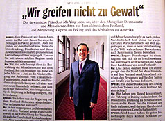 德國《明鏡》周刊4月下旬在臺北專訪馬英九,談兩岸關(guān)系的發(fā)展、“臺美中三邊關(guān)系”及亞洲的新形勢。