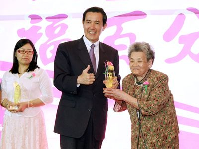 馬英九(中)8日出席在臺(tái)中市舉辦的“母愛(ài)100幸福百分百─母親節(jié)慶祝活動(dòng)”,頒獎(jiǎng)表?yè)P(yáng)堅(jiān)忍卓越的臺(tái)灣模范母親。圖片來(lái)源:臺(tái)灣“中央社”