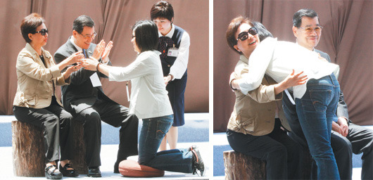 蕭萬(wàn)長(zhǎng)(中)與夫人朱俶賢(左)昨天上午與女兒蕭至佑,一同參加法鼓山“知福幸福—媽媽好幸福”感恩活動(dòng),蕭至佑跪著為媽媽奉上一杯茶水,感謝母親平日的辛勞,并給媽媽一個(gè)深深的擁抱(右圖)。來(lái)源:臺(tái)灣聯(lián)合報(bào)