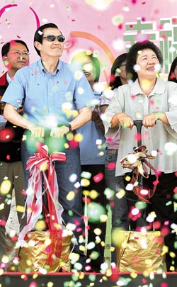 高雄六龜溫泉與農特產業嘉年華系列4日舉行開幕儀式,馬英九(左)與高雄市長陳菊(右)一起加油集氣,釋放夢想氣球為活動揭開序幕。圖片來源:臺灣《中國時報》
