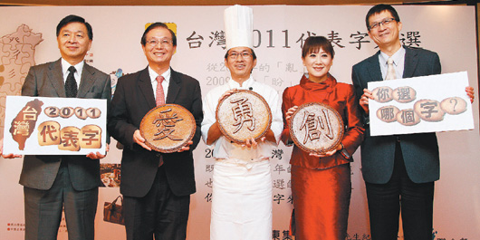 臺(tái)灣教育部門(mén)負(fù)責(zé)人吳清基(左二)、面點(diǎn)師吳寶春(中)及SOGO百貨董事長(zhǎng)黃晴雯(右二)昨天在“臺(tái)灣2011代表字大選”公布候選字記者會(huì)中,手持印有“愛(ài)、勇、創(chuàng)”的烘焙面包,與徐元智先生紀(jì)念基金會(huì)執(zhí)行長(zhǎng)黃茂德(左)、《聯(lián)合報(bào)》總編輯羅國(guó)俊(右)為活動(dòng)造勢(shì)。(圖片來(lái)源:臺(tái)灣《聯(lián)合報(bào)》)