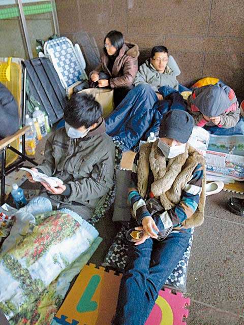 臺北市府一樓的申請路權排隊區,國民黨與民進黨分別派人漏夜排隊,還準備睡袋。圖片來自臺媒
