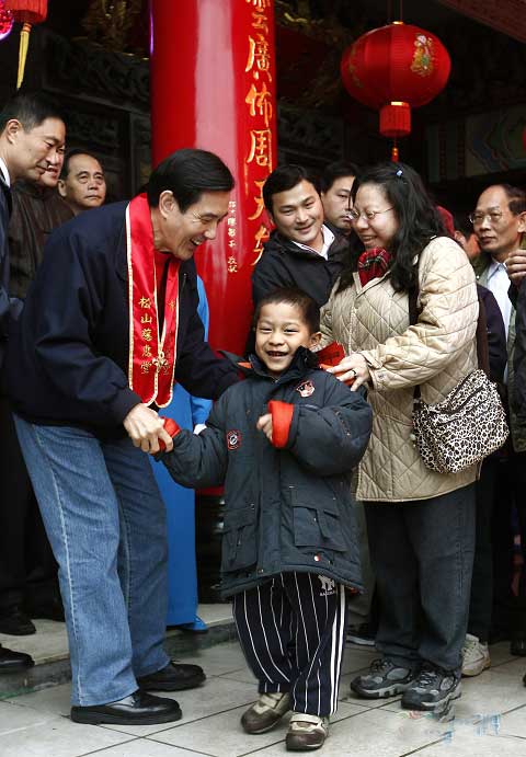今日,馬英九在臺(tái)北市長(zhǎng)郝龍斌的陪同下,前往松山慈惠堂參拜,祈福參拜。一早就有超過500名民眾攜家?guī)Ь烀坝昱抨?duì),等著從馬英九手中領(lǐng)取新春福袋討吉利。面對(duì)大排長(zhǎng)龍的民眾,馬英九發(fā)福袋身手利落,1分鐘發(fā)出超過30個(gè)福袋,同時(shí)與民眾一一握手親切寒暄。