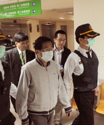 陳水扁(左二)清晨在法警戒護下,前往桃園醫院接受健康檢查,陳水扁未戴戒具,由兒子陳致中(右二)陪同步行在醫院內接受包括超音波與斷層掃描等多項檢驗。圖片來源:臺灣《聯合報》
