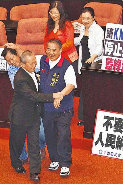 昨午后氣氛轉變,下午2時就傳國民黨將在4時發動進攻,搶回主席臺,綠營“立委”陸續進場備戰。將近4時,藍營“立委”廖正井、林郁方等進議場,民進黨團總召柯建銘還找兩人聊一陣子,互探虛實。