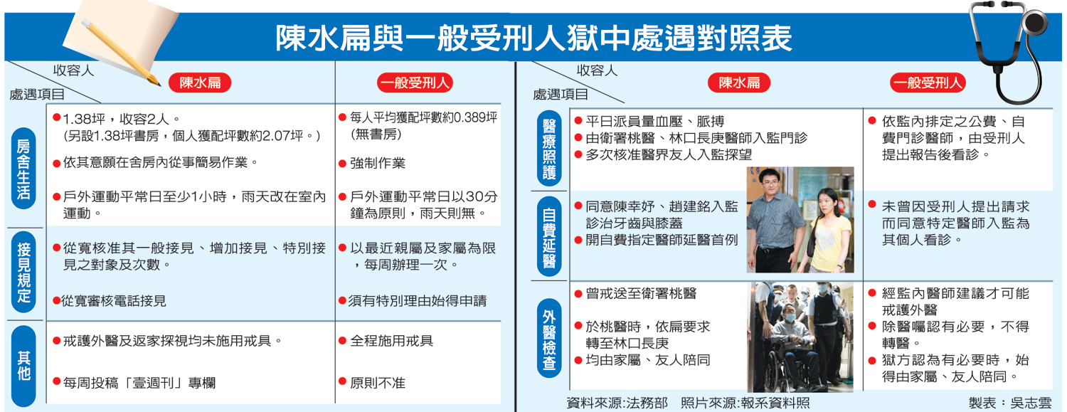 此外,在醫(yī)療照顧方面,北監(jiān)也不敢怠慢,除監(jiān)內(nèi)排定的醫(yī)師外,另由衛(wèi)生主管部門桃園醫(yī)院、林口長(zhǎng)庚醫(yī)院特別指派?漆t(yī)生入監(jiān)為陳水扁診療約50次以上,其他并有陳水扁的醫(yī)界友人以特別接見方式,進(jìn)入北監(jiān)關(guān)心、了解陳水扁的病情;同時(shí),其女婿趙建銘和女兒陳幸妤均分別入監(jiān)替其治療膝蓋、洗牙和制作假牙,成為北監(jiān)自費(fèi)指定醫(yī)師延醫(yī)的首例。