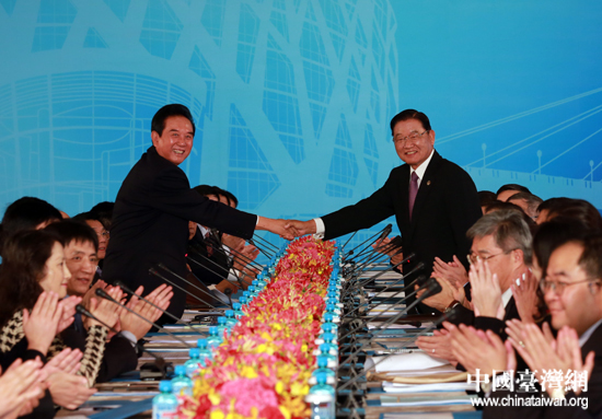 8月9日上午,兩岸兩會領(lǐng)導(dǎo)人第八次會談在臺北圓山飯店舉行。圖為海協(xié)會會長陳云林與臺灣海基會董事長江丙坤在會談前握手致意。(中國臺灣網(wǎng) 田云鵬 攝)