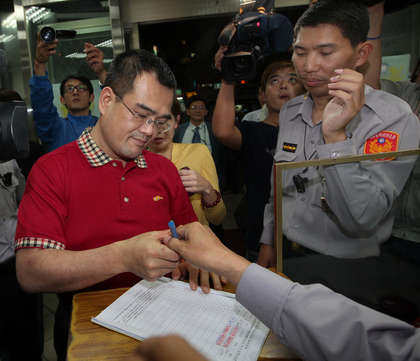 林益世(左)到派出所簽到。圖片來自臺媒