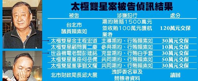 同遭聲押的被告包括曾任臺北市政府捷運局處長的太極雙星顧問賈二慶,以及太極雙星幕后金主程宏道;賈認罪獲10萬元交保,程雖坦承支付賴素如100萬元,但辯稱是公關費,否認行賄,獲30萬元交保。檢方無法接受交保,決定實時抗告。