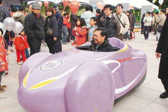臺(tái)灣明道大學(xué)研發(fā)氫能燃料電池車在“國際燃料電池車觀摩會(huì)”上現(xiàn)身相當(dāng)顯眼,該校校長汪大永在廣場試乘時(shí),引起矚目。圖片來源:臺(tái)灣《聯(lián)合報(bào)》