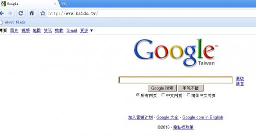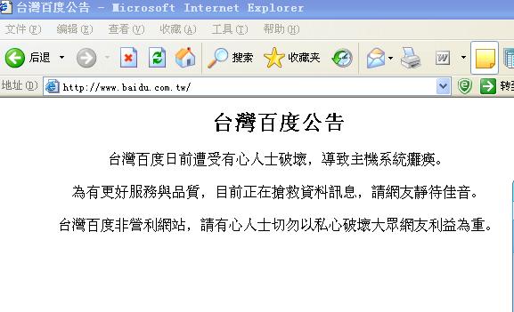 12日,百度被黑長達6個小時之久,中國大部分地區的網友都稱在家無法登錄,更有網友將百度被黑之后的圖像上傳到了網上。一波未平一波又起,這次被殃及的不但是百度本身,就連山寨版“百度臺灣”都沒有逃過。13日上午,打開“百度臺灣”(www.baidu.tw)之后網友們發現,頁面上赫然顯示著“谷歌臺灣”的字樣。一時間,網絡惡搞風吹向百度。有網友稱百度被黑引發了“2010中國互聯網賀歲劇”。